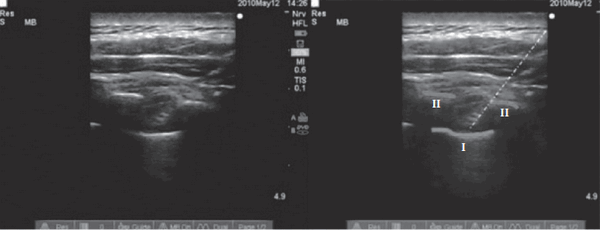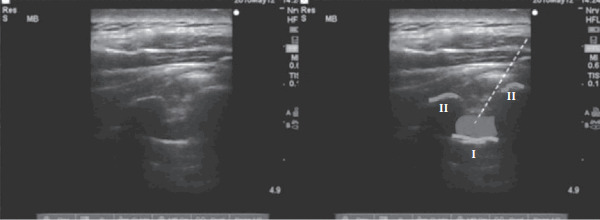 Рис. 4. УЗ-картина при проведении торакальной ПВБ (линия I — париетальная плевра,