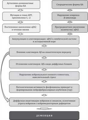 Еще недавно считалось, что первоначально (на преклинической стадии) патологический процесс связан с накоплением β-амилоида, которое, достигнув критического уровня, нарушает метаболизм τ-протеина, с накоплением которого в форме интранейрональных нейрофибриллярных клубочков и их «экспансией» в веществе мозга коррелируют клинические проявления заболевания. В настоящее время показано, что по крайней мере в значительной части случаев дегенеративный процесс начинается с нарушения метаболизма и агрегации τ-протеина либо параллельной конверсии β-амилоида и τ-протеина в растворимые олигомерные формы, которые взаимно усиливают токсичность друг друга и последовательно поражают различные отделы мозга, возможно, благодаря механизмам, напоминающим распространение патологического прионного белка.