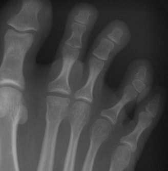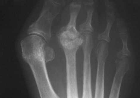 Определяется деформация и уплощение головки 2, 3, 4 плюсневой кости. На фоне разряжения структуры костной ткани головки дифференцируются плотные островки с четкими, неровными контурами. Дистальный метафиз 2 плюсневой кости несколько утолщен, по всей видимости, за счет периостальных наслоений. Суставная щель во 2 плюсне - фаланговом суставе расширена.