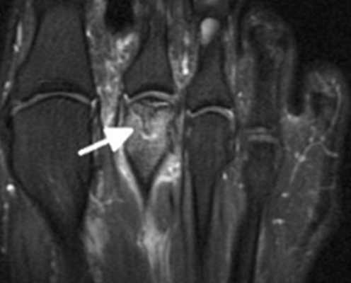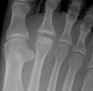 Суставные поверхности, образующие плюсне-фаланговый сустав, инконгруэнтны, форма суставных поверхностей деформирована, уплощена, склерозирована в области . Величина суставных поверхностей увеличена за счет краевых костных разрастаний. Контуры замыкательных пластинок эпифизов ровные, чёткие. Подхрящевой (субхондральный) остеосклероз, как свидетельство функциональной несостоятельности суставных хрящей и свидетельствующий о перегрузке костной ткани, определяется в области . По краям суставных поверхностей определяются костные разрастания (свидетельствуют о функциональной несостоятельности суставных хрящей).