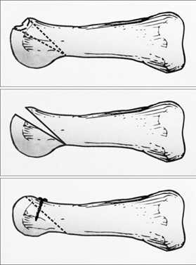 В первых трёх стадиях заболевания хорошо себя зарекомендовала тыльная клиновидная остеотомия, которая позволяет одновременно удалить очаг деструкции и поставить на его место сохранившуюся и кровоснабжаемую подошвенную часть головки плюсневой кости.