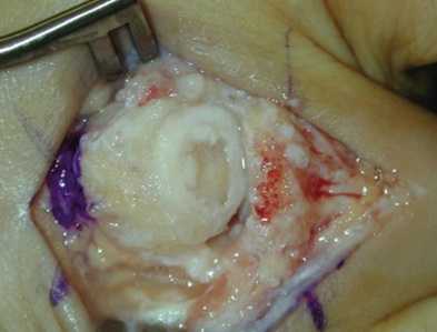 Артротомия и дебридмент в настоящее время применяется всё реже. Помимо удаления свободных хондромных тел, резекции воспаленной синовиальной оболочки, могут применяться рассверливание головки плюсневой кости, интерпозиция сухожилия длинного разгибателя пальцев в полость сустава.