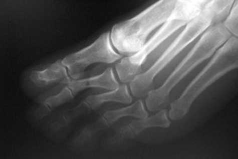 - Болезнь КеллераII. На снимках выявляются патологические изменения в головке пораженной плюсневой кости. В зависимости от срока заболевания может обнаруживаться остеопороз, уплотнение и деформация головки плюсневой кости, ее патологический перелом и дефрагментация.