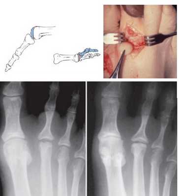 Используется 3 основных вида оперативных вмешательств: артротомия и дебридмент, дорсальная клиновидная остеотомия, частичная резекция головки плюсневой кости.