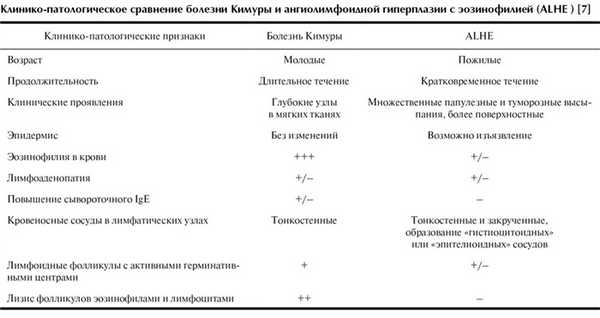 В 1969 г. G. Wells и соавт. [1—5] сообщили о заболевании, которое они назвали ангиолимфоидной гиперплазией с эозинофилией (Angiolymphoid hyperplasia with eosiniphilia - ALHE), отметив его сходство с БК. Многие авторы долгое время считали (а некоторые считают и до сих пор), что речь идет об одном и том же заболевании. Однако на основании клинических и гистопатологических данных ряд исследователей рассматривают их как различные нозологии [6]. Хотя для каждого из этих заболеваний характерно вовлечение сосудов, при ALHE артериовенозная патология имеет вторичный воспалительный характер, а при БК первичным является воспалительный процесс, а пролиферация сосудов вторична [7] (см. таблицу).