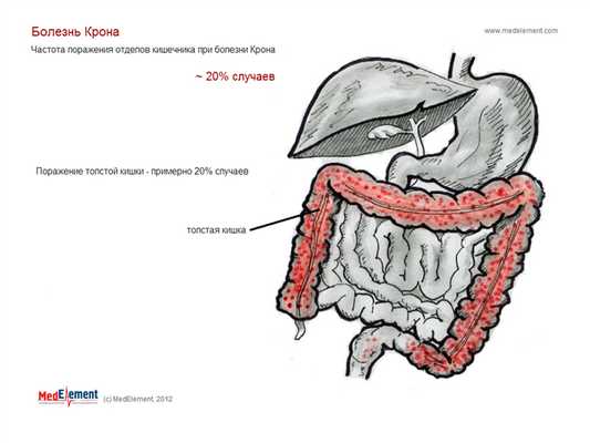 - толстая кишка (в том числе прямая) - 20%, только аноректальная область - 2-3% (см. " Болезнь Крона толстой кишки" - K50.1);