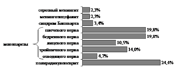 Клинические проявления нейроборрелиоза характеризовались наиболее частым вовлечением в патологический процесс соматической ПНС - в 93,0±2,8% случаев, причем в сочетании с поражением опорно-двигательного аппарата в 48,8±5,4% случаев, в сочетании с поражением ЦНС - в 1,2±1,2% случаев. Поражение соматической ПНС характеризовалось мононевритом плечевого нерва (n=17, 19,8±4,3%), бедренного нерва (n=17, 19,8±%), лицевого нерва (n=9, 10,5±3,3%), тройничного нерва (n=12, 14,0±3,7%), отводящего нерва (n=4, 4,7±2,3%), полирадикулоневритом (n=21, 24,4±4,6%; рис. 1). Мононевриты плечевого, бедренного и тройничного нервов регистрировались чаще, и наблюдались в основном у пациентов после перенесенных безэритемной формы болезни и сочетанного течения ИКБ и КЭ. Полирадикулоневрит с преимущественным поражением шейного и поясничного отделов позвоночника сопровождался умеренным корешковым синдромом, люмбалгиями, цервикалгиями.