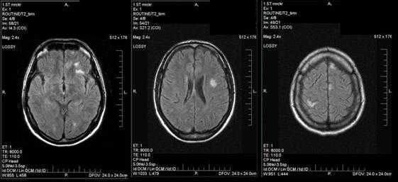 Органическое поражение ЦНС выявлено лишь у 1 (1,2%) пациента при длительном течении ИКБ (около 2-х лет) при отсутствии своевременной верификации диагноза, а следовательно, адекватной этиопатогенетической терапии. Клинические проявления характеризовались постоянной головной болью на фоне субфебрильного повышения температуры тела, снижением памяти, концентрации внимания. По результатам МРТ головного мозга выявлены мультифокальные очаги преимущественно белого вещества обоих полушарий и левой гемисферы мозжечка (рис. 2). В результате этиопатогенетической терапии клиническая симптоматика регрессировала, согласно результатам МРТ головного мозга, проведенного через 6 месяцев, количество очагов поражения белого вещества уменьшилось.