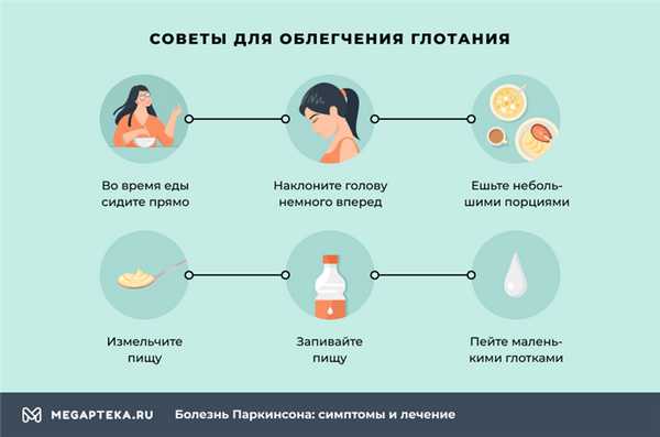 Обработка пищи имеет значение — сухие и жареные блюда хуже проглатываются. Отдавайте предпочтение отварным или пюреобразным продуктам. Если во время приема пищи вам мешает дрожание рук, воспользуйтесь специальными средствами: соломинка для питья или «непроливайка», тарелка с креплением к столу. Отдавайте предпочтение ложке, вместо вилки.