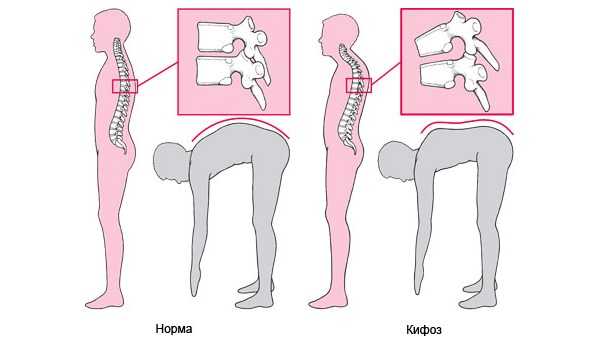 Сутулость (патологический грудной кифоз) возникает из-за клиновидной деформации тел позвонков, в результате которой его передняя поверхность становится ниже задней. Позвоночный столб прогибается назад.