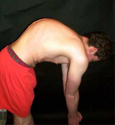 Чаще всего поражается грудной отдел позвоночника, однако грудопоясничный и поясничный отделы - не исключение. На фото изображен 22-летний мужчина с тяжелой стадией болезни Шейермана (перед операцией).