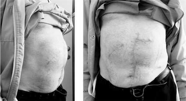 Пациент И. 75 лет. Передняя брюшная стенка мужчины с гигантской послеоперационной грыжей. За 8 лет грыжевой дефект распространился на четыре анатомические области.