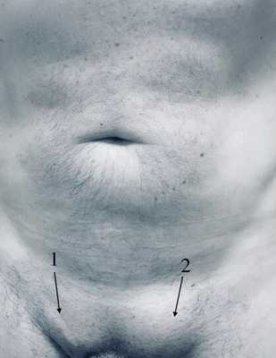 Вид передней брюшной стенки мужчины с паховой грыжей: