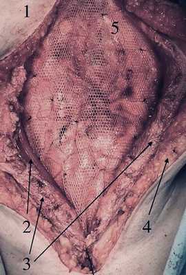 Один из этапов хирургического лечения гигантской грыжи передней брюшной стенки. Фиксация сетчатого трансплантата на место грыжевого дефекта. Цифрами указаны слои передней брюшной стенки и сетчатый протез.