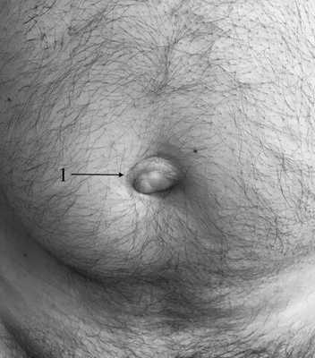 Вид передней брюшной стенки мужчины с пупочной грыжей