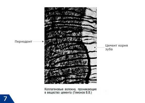 Самой важной частью коллагеновых волокон цемента являются так называемые «шарпеевские волокна». Они являются терминальными участками волокон периодонтального прикрепления зуба со стороны цемента. На рис.7 вы можете увидеть гистологический препарат, на котором видно, что радиальные коллагеновые волокна периодонтальной щели и цемента корня зуба - являются «единым целым».