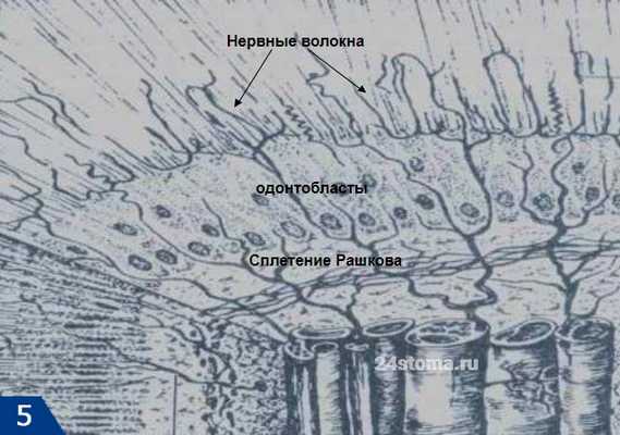 Нервные волокна образуют субодонтобластическое нервное сплетение, которое расположено под слоем одонтобластов (его еще называют сплетением Рашкова). От этого сплетения отходят безмиелиновые нервные волокна, которые направляются к периферическим областям пульпы, где они как бы оплетают одонтобласты, образуя между одонтобластами и предентином - так называемое «надодонтобластическое сплетение». Часть нервных волокон оканчивается в этом сплетении, но оставшаяся их часть - проникает в дентинные трубочки.
