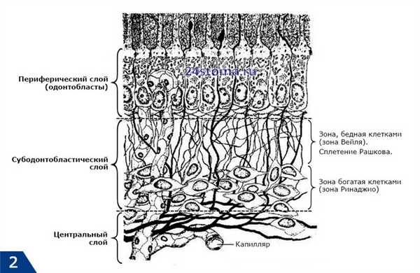 Где 2 - пульпа зуба (где 2а - периферический слой, состоящий из одонтобластов, 2б - зона, бедная клетками, в промежуточном слое пульпы, 2в - зона, богатая клетками, в промежуточном слое пульпы, 2г - центральный слой пульпы).