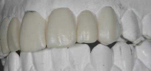 В тех случаях, когда искусственные коронки изготавливаются в лаборатории, манипуляции осуществляются на модели с отпрепарированными под керамические коронки зубами при помощи полученного ранее, до препарирования зубов, оттиска или силиконового шаблона (рис. 10) . Аналогично работе, выполняемой в клинике, канюлю смесителя вводят внутрь шаблона и заполняют пространство от режущего края до шейки зуба. Шаблон надевается на зубные ряды под адекватным давлением и удаляется в соответствии с интервалами времени, указанными в инструкции (зависит от температуры окружающей среды). Временные коронки припасовываются и обрабатываются на модели (рис. 11) . Затем снимаются и передаются в клинику.