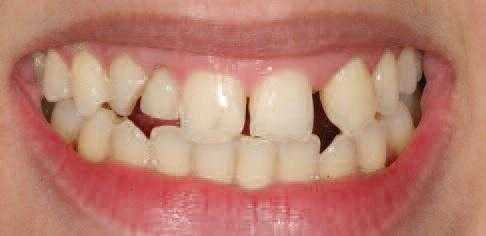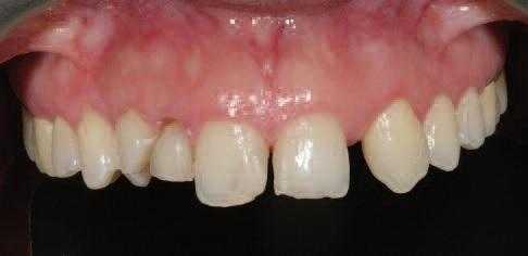 Через некоторое время провизорные реставрации были удалены. Учитывая точковый принцип их адгезивной фиксации они легко могут быть удалены при помощи скейлера, кюреты или достаточно надежного зонда. Как правило, во время удаления реставрации разрушаются. В данное время наш пациент проходит ортодонтическое лечение, цель которого состоит в коррекции положения зубов верхней челюсти и закрытии диастемы между центральными резцами. Кроме того, ортодонтическое лечение позволит скорректировать соотношение зубных дуг и добиться состояния стабильной окклюзии. После использования брекетов пациенту будет проведено восстановление 22 зуба при помощи реставрации на мини-имплантате.