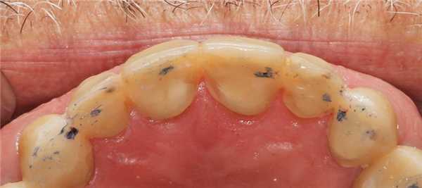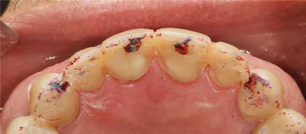 Фото 4. Точки стабильного контакта на язычной поверхности верхних передних зубов.