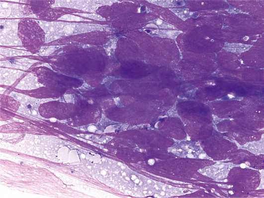 Цитологическое исследование базируется на морфологических особенностях отдельных клеток, кластеров клеток и мелких, часто трехмерных фрагментов ткани. Сохраненная тканевая архитектура не является существенной, но в основном также доступна для цитологической оценки. Цитологический диагноз МРЛ основан прежде всего на тщательной оценке различных цитологических критериев опухолевых клеток. Классическим цитологическим признаком МРЛ является расположение клеточных элементов в небольших, часто разветвленных скоплениях с формированием межклеточных связей по типу «фасеток», иногда «стопки монет». Приспосабливаясь по форме друг к другу, опухолевые клетки имеют различные размеры — от мелких до достаточно крупных, округлую, иногда несколько вытянутую неправильную форму, скудную цитоплазму, мелкозернистый тяжистый гипохромный ядерный хроматин по типу «соль—перец» и едва различимые или отсутствующие ядрышки (рис. 1). Рис. 1. Мелкоклеточный рак легкого. Много фигур митоза. Так как вследствие усиленного деления не успевают сформироваться структурные компоненты клетки, они становятся очень нежными и хрупкими, легко разрушаются при малейшей травматизации, что может привести к наличию волокна ядерного хроматина (краш-синдром, или эффект раздавливания) — один из дополнительных морфологический признаков МРЛ. Часто имеется довольно обширный некроз [3].