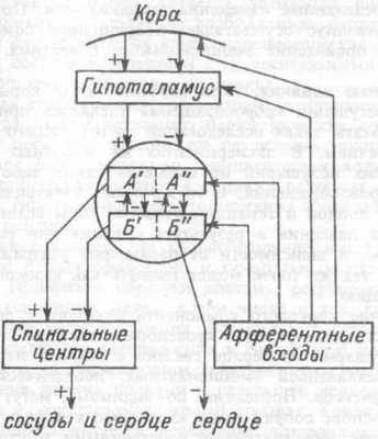 Рис.7.27. Схема организации центральных звеньев нервной регуляции сердечно-сосудистой системы. Объяснение в тексте.