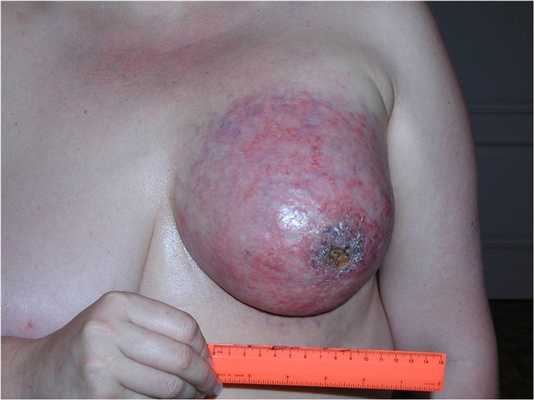 К 4 стадии рака молочной железы относится воспалительный рак, он встречается до 10 % всех случаев. Симптомы воспалительной формы рака груди это покраснение кожных покровов, железа становится теплой, отмечается увеличение и/или уплотнение части либо всей молочной железы. Кожа приобретает вид апельсиновой корки. Эту форму рака надо дифференцировать с воспалением молочной железы - маститом.