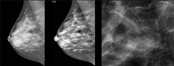 Для выявления злокачественных опухолей молочной железы существует определенный алгоритм диагностики, и его первичный элемент — маммографический скрининг. Чувствительность этого метода диагностики для опухолей от 2 мм до 5 мм составляет около 85%. Маммографическое исследование выполняют в двух проекциях.