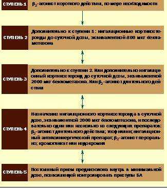 Традиционно при нетяжелой БА применяют только b2-агонисты. Если таким образом не удается адекватно контролировать заболевание, следующим шагом при лечении взрослых является введение ингаляционного кортикостероида в небольшой дозе, не более 800 мкг беклометазона (или эквивалент) в сутки.