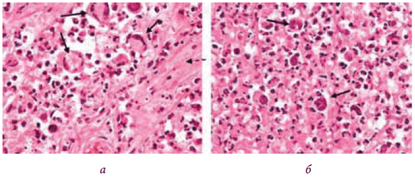 Рис. 6. Морфологические препараты (окраска гематоксилином и эозином, . 400): а, б — среди обширных участков некроза (прерывистая стрелка) — гигантские многоядерные клетки Ходжкина и Рида - Штернберга (сплошные стрелки), лимфоциты, макрофаги, эозинофильные лейкоциты