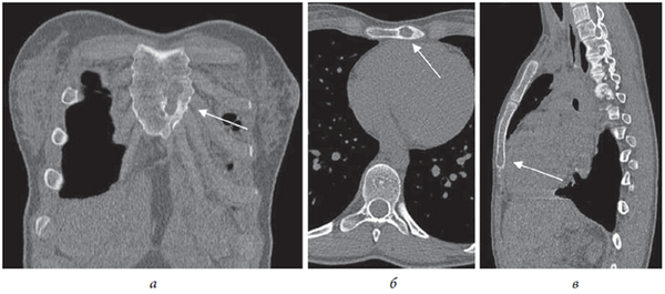 Рис. 2. Больная Г., 12 лет. КТ-срезы грудной клетки (костный режим): а —фронтальный; б — аксиальный; в — сагиттальный. Стрелкой указана область деструкции грудины