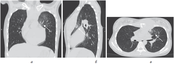 Рис. 3. Больная Г., 12 лет. Компьютерные томограммы грудной клетки (легочной режим): а — фронтальный срез; б — сагиттальный срез; в — аксиальный срез. Стрелкой указана зона инфильтративных изменений в S3-сегменте слева