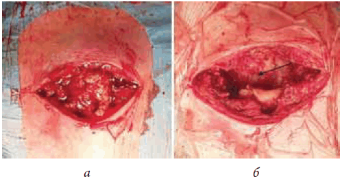 С лечебно-диагностической целью с учетом распространенности поражения и его осложнений 27.12.2016 выполнена операция в объеме фистулоабсцесснекрэктомии. При вмешательстве выявлена субтотальная деструкция тела и рукоятки грудины; хрящевой конец 3-го ребра располагался свободно; парастернальные патологические ткани представляли собой жидкий гной и грануляционно-некротический детрит (рис. 5, а). После некрэктомии размеры полости составили 100 × 40 × 30 мм, дном полости являлся перикард (рис. 5, б). Рана ушита в условиях дефицита мягких тканей с их натяжением, в связи с чем на 7-е сутки отмечалось частичное расхождение швов с обильным серозным отделяемым (посев стерилен). На фоне местного лечения достигнуто вторичное заживление раны на двадцатые сутки после операции.
