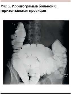 Пациентка С. 34 лет обратилась с жалобами на боли в мезогастрии, в нижних отделах живота, дипареунию, вздутие живота. Осмотрена гинекологом - без органической патологии. При ирригоскопии (рис. 5) толстая кишка удлинена за счет сигмовидной кишки, также удлинена поперечно-ободочная кишка, которая имеет дополнительные изгибы в области печеночного и селезеночного углов, центральная часть поперечно-ободочной кишки расположена над входом в малый таз.