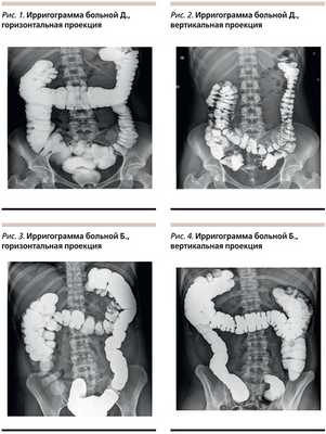 Пациентка Д. 26 лет обратилась с жалобами на боли в нижних отделах живота без связи с актом дефекации, нарушениями стула; вздутие живота, «живот как каменный». При ирригоскопии (рис. 1) толстая кишка удлинена, образует дополнительные петли в области селезеночного и печеночного углов, поперечно-ободочный отдел опускается до уровня L4-L5. Восходящий отдел также удлинен, купол слепой кишки в малом тазу на уровне ректо-сигмоидного перехода. В вертикальной проекции (рис. 2) печеночный угол смещается до уровня крыла подвздошной кости, купол слепой кишки и часть поперечно-ободочной кишки в проекции малого таза.