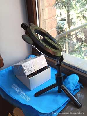 Я не умею делать нормальные на мой взгляд фотографии без кольцевой лампы. А ещё у меня перфекционизм, поэтому вот, маленькая кольцевая лампа и коробочка с тем, на что планировались обзоры. Лампа с коробкой стоят на моих дорожных многоразовых «пакетах» для одежды, которые когда-то достались мне в подарок к линзам, но оказались очень удобными. Белая надпись, которая мелькает во всех фотографиях, это часть их дизайна)) Как только они порвутся, буду искать новые.