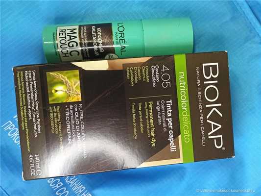 Краска для волос и спрей-корректор: мой родной цвет волос значительно светлее, чем тот, в который я крашусь, поэтому отросшие корни выглядят ну очень некрасиво. Я взяла с собой упаковку краски для волос от BioKap (на самом деле две, просто умудрилась всё это упаковать в одну коробку) и спрей для маскировки отросших корней от L'Oreal.