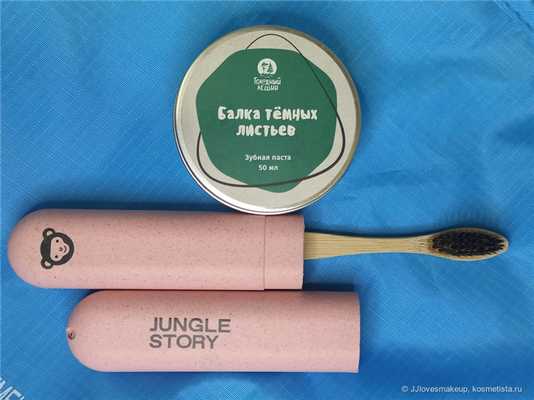- Бамбуковая зубная щёткав чехле, сделанной из растительного (по-моему, кукурузного) волокна от Jungle Story. Отказ от пластмассовых зубных щёток это мой посильный вклад в уменьшение количества пластикового мусора. Также, я взяла ватные палочки на бамбуковой основе, но на фото они не попали.