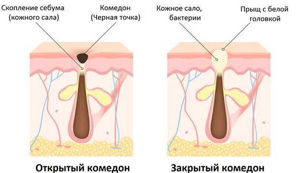 Закрытые (прыщи) — это полости в толще кожи, заполненные ороговевшими клетками и секретом сальной железы. Воспаляясь, они краснеют, а потом превращаются в болезненные пустулы, заполненные гноем.