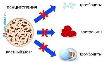 - Панцитопению (сбой пошел в трех направлениях, поэтому резко снижено количество белых и красных клеток крови, а также тромбоцитов).