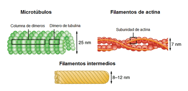 Это актиновые волокна, промежуточные нити и микротрубочки. Каждый из них предоставляет определенное свойство сети. Внутренняя часть ячейки - это среда, в которой происходит перемещение и перемещение материалов. Цитоскелет опосредует эти внутриклеточные движения.