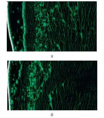 Одним из объективных методов оценки состояния кожи является ультразвуковое исследование (УЗИ). У пациента с нормальной кожей при УЗИ видны сглаженность рельефа эпидермиса, равномерное распределение эхосигнала; эпидермис четко отграничен от дермы, дерма дифференцирована на отделы, расположение волокон дермы линейное (рис. 1, а). Рисунок 1. Ультразвуковая картина кожи в норме (а) и у пациента с себореей (б). У пациента с себореей отмечаются изменение эхоструктуры эпидермиса, нарушение его рельефа, протоки сальных желез расширены; отсутствует четкая граница между эпидермисом и дермой, эхогенность субэпидермального отдела дермы снижена (рис. 1, б).
