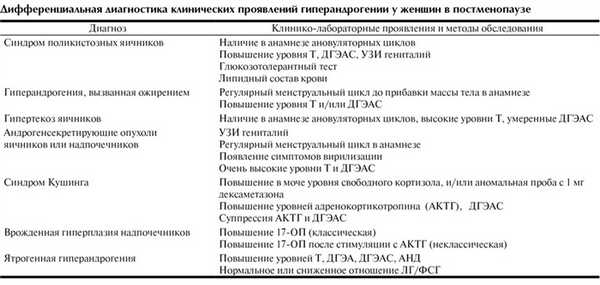 Диагностика. Лабораторные исследования включают определение уровня свободного тестостерона, 17-ОГП, ДГЭАС и пролактина. Повышение уровня 17-ОГП (измеряют утром) позволяет заподозрить врожденную гиперплазию надпочечников. Повышение уровня свободного тестостерона подтверждает чрезмерную продукцию андрогенов, сопроводительное повышения ДГЭАС свидетельствует о поражении надпочечников.