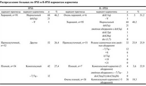 Несмотря на недостатки новой прогностической шкалы, следует признать, что, используя критерии R-IPSS, удалось стратифицировать 84% больных, в то время как по шкале IPSS — только 74% больных (см. таблицу).