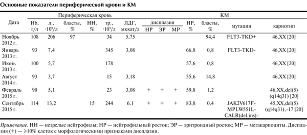 С декабря 2012 г. по июль 2014 г. отмечены следующие лабораторные находки: тромбоцитопения (40—70)·10 9 /л, ассоциированная с интерферонотерапией. Дисплазия единичных клеток нейтрофильного ростка как следствие Х.Т. Нормальный кариотип. Отсутствие мутаций в генах FLT3 и NPM1.