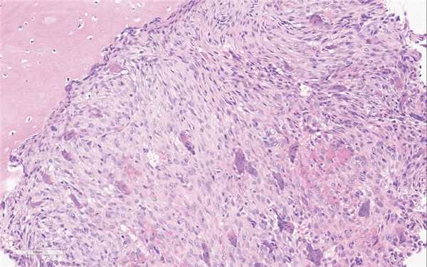 Рис. 7. МФД/НОФ всегда четко ограничены, местами могут содержать большое количество гигантских многоядерных остеокластоподобных клеток. Окраска гематоксилином и эозином, ×300.