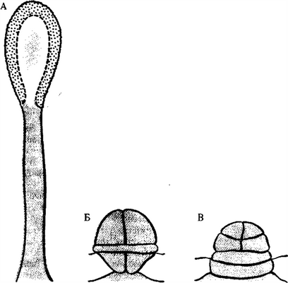 Столбчатые (А) и сидячие (Б, В) железы листа росянки
