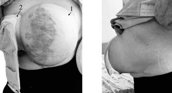Пациент И. 75 лет. Передняя брюшная стенка мужчины с гигантской послеоперационной грыжей. За 8 лет грыжевой дефект распространился на четыре анатомические области.