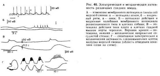 Ионный механизм возникновения потенциалов действия в гладких мышцах несколько отличается от такового в скелетных мышцах. Установлено, что деполяризация мембраны, лежащая в основе потенциала действия в ряде гладких мышц, связана с активацией электровозбудимых кальциевых каналов. Следует подчеркнуть, что эти каналы проницаемы не только для ионов Са²⁺ и некоторых двухвалентных катионов (Ва²⁺, Sr² ⁺), но и для ионов Na ⁺. От «быстрых» натриевых каналов, обеспечивающих генерацию потенциалов действия в нервных и скелетно-мышечных волокнах, «медленные» кальциевые каналы отличаются не только своей ионной избирательностью, но также кинетикой процессов активации и инактивации и чувствительностью к блокаторам. Кальциевые каналы активируются и инактивируются значительно медленнее, чем натриевые; они не чувствительны к тетродотоксину, но эффективно блокируются изоптином (верапамилом), ионами Са²⁺, Мп²⁺ и La³⁺. Изоптин применяют в медицинской практике для устранения или предупреждения спазма сосудов.